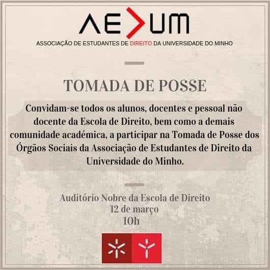 Conforme o artigo 54º, número 1 dos Estatutos da AEDUM, os órgãos deverão tomar posse até oito dias após a eleição. Assim, temos todo o gosto em convidar V. Exa. a marcar presença na cerimónia que será realizada no próximo dia 12 de março, pelas 10h, no Auditório Nobre da Escola de Direito da Universidade do Minho.